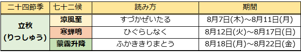 季節を表す二十四節気では8月7日(木)~8月22日(金)までを立秋(りっしゅう)と言います。
