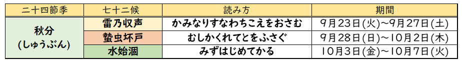 二十四節気をさらに細かく分類する七十二候では、秋分の時期は3つに分類されます。