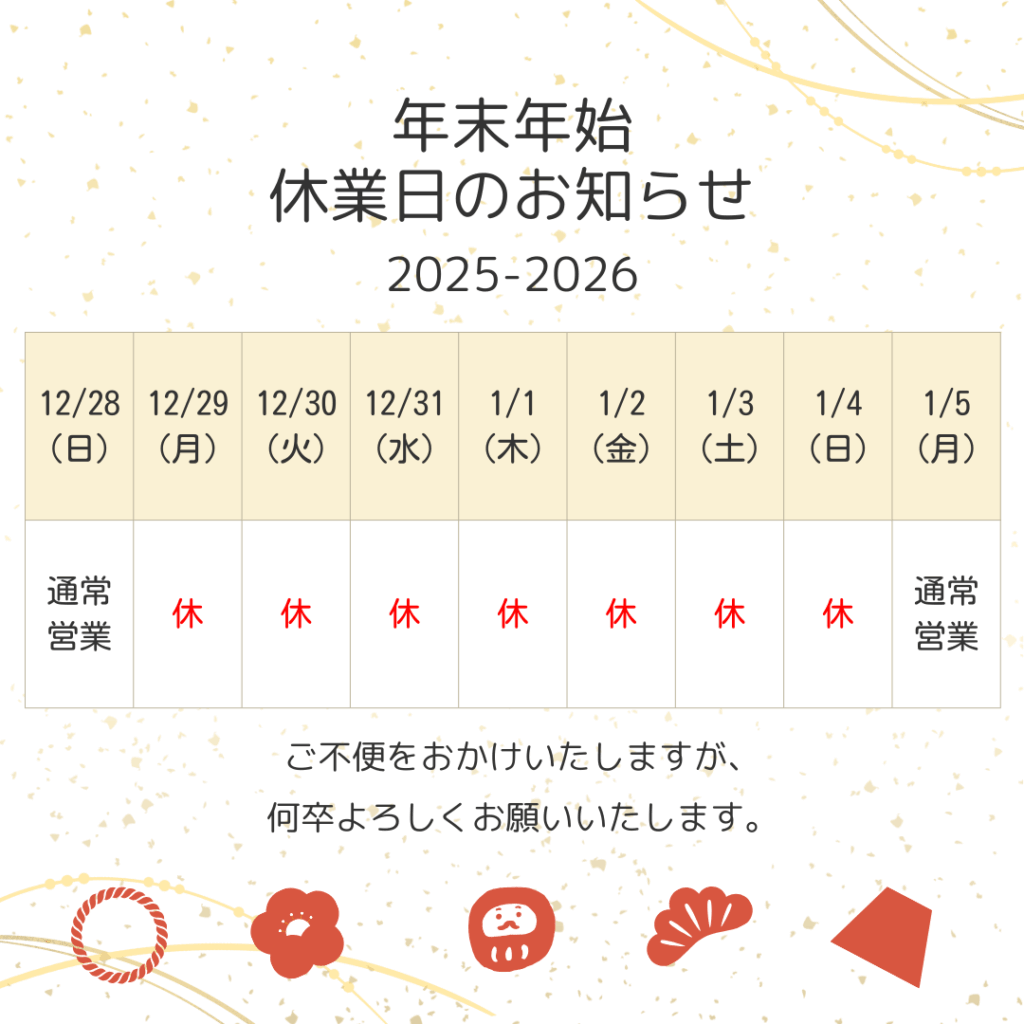 年明けは2026年1月5日(月)より通常通り営業致します。