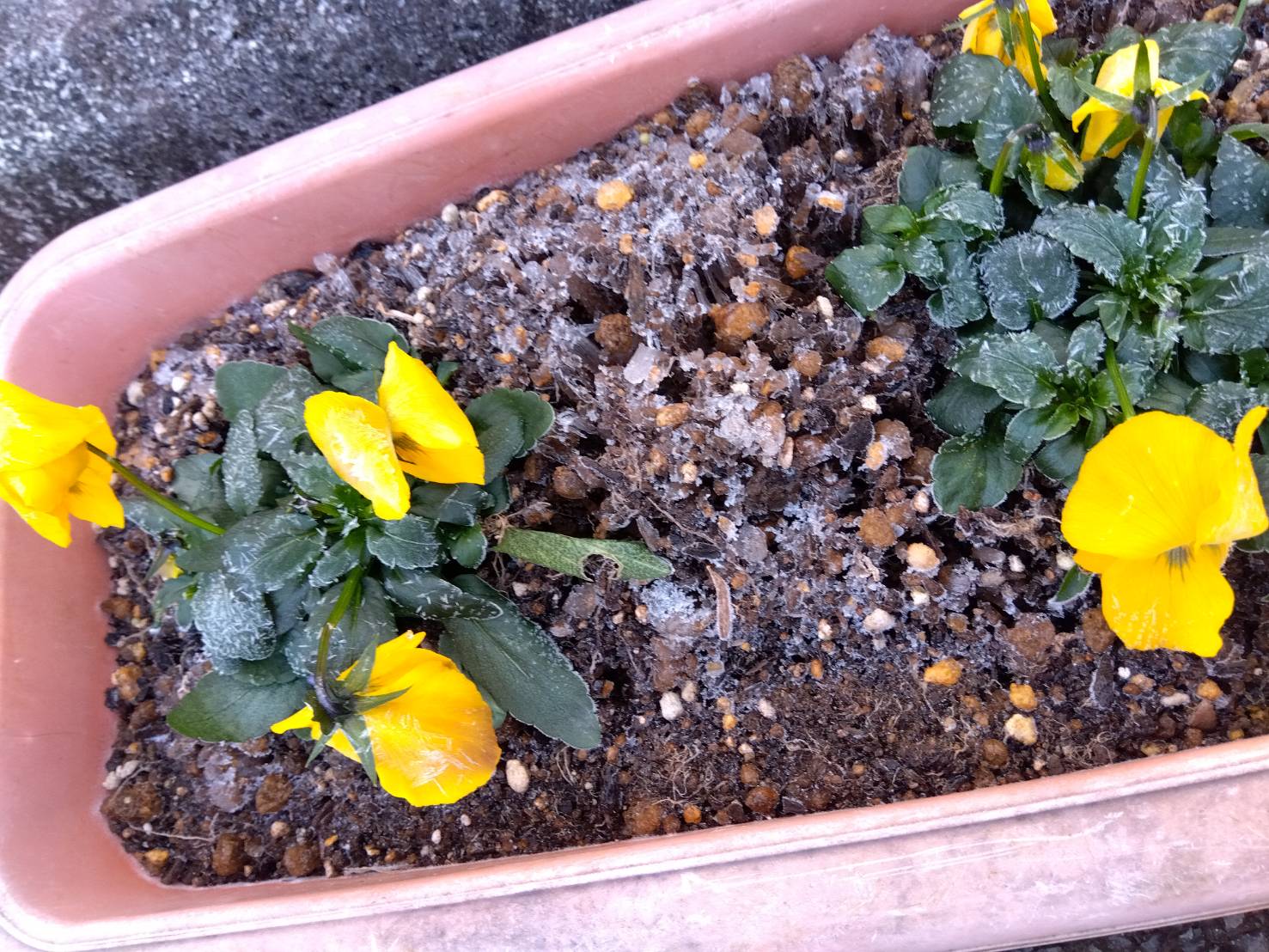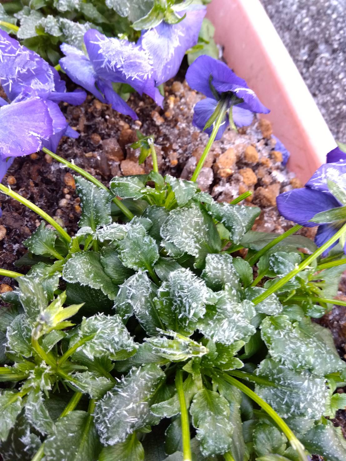 昨日は花壇の花や葉に霜がおり、水道も凍ってしまいました><