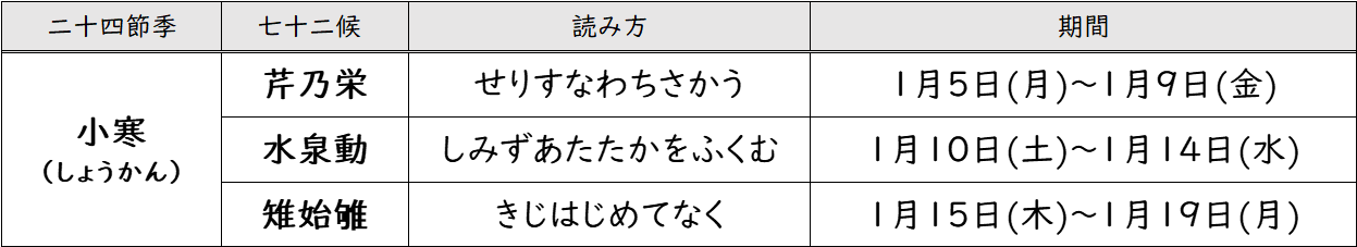 季節を表す二十四節気では1月5日(月)~1月19日(月)までを小寒(しょうかん)と言います。