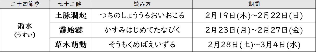 雨水とは”雪が雨に変わり氷も溶けて水になる頃”を意味します。