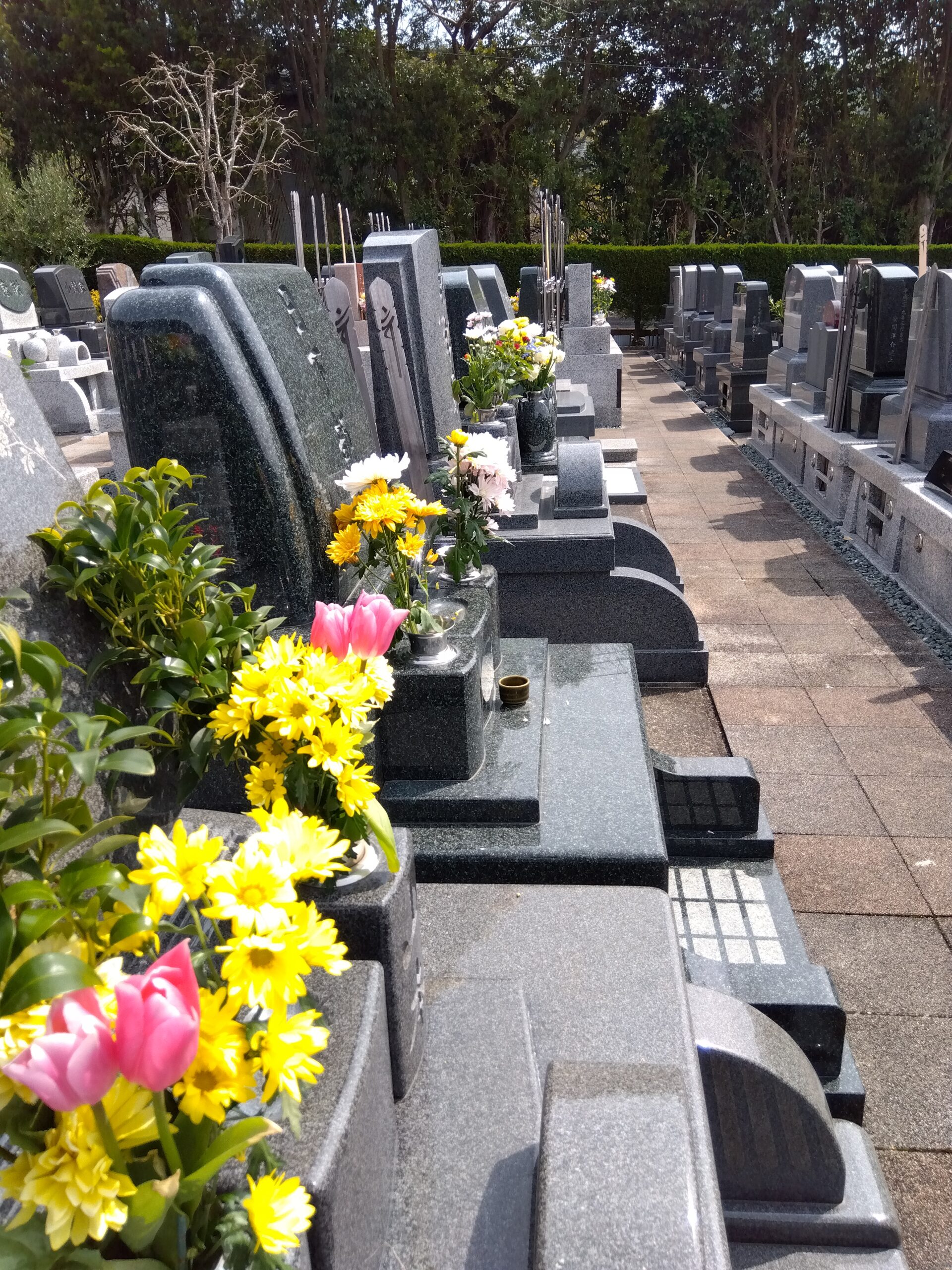 園内では、色とりどりのお供えのお花が美しく並び、大切な方への感謝や想いが感じられる光景が広がっています。春のやわらかな日差しの中で、お花の彩りが一層引き立ち、心安らぐ雰囲気に包まれています。