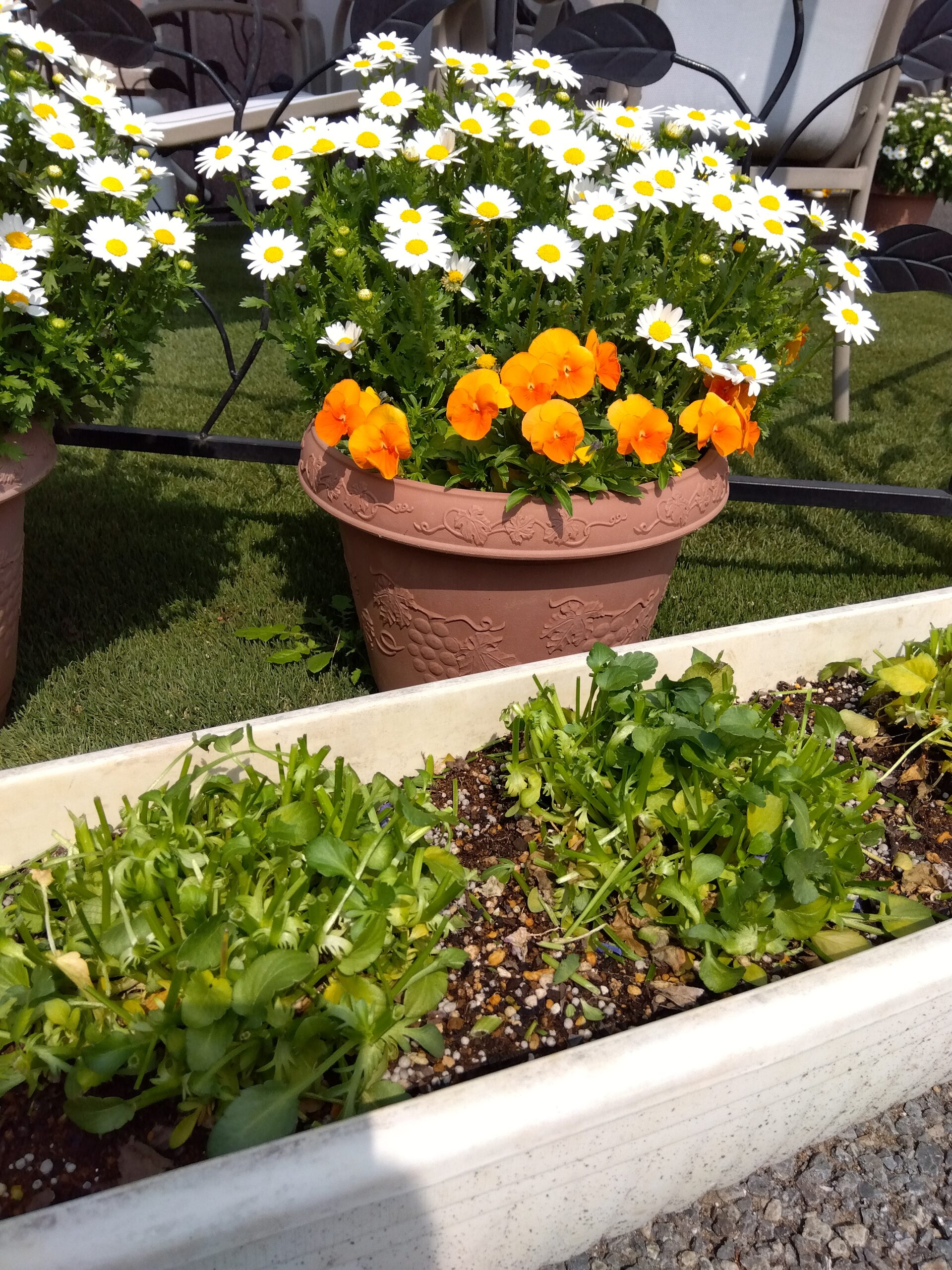 プランターでは、オレンジや黄色のパンジーが元気に咲いています。実は今、スタッフがこまめに**「切り戻し」**のお手入れをしています。